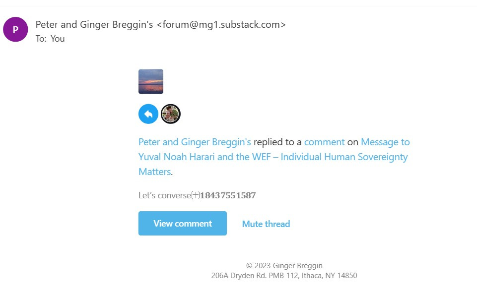 The attached email came to me and it took me a bit to realize that it also went to a commenter on this column we had written. Note the name of the counterfeit Substack is “Peter and Ginger Breggin’s”…….our name is Breggin. And our Substack has a different, longer name.
