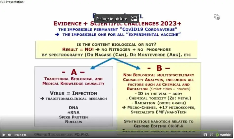Dr. Stuckelberger’s talk was titled “From Biology to Population: Evidence-Based Public Health Situations: Analysis, Lessons and Next Steps.” “Censorship occurred at point C when I presented the results of nanotech and oxide graphene in the vials,” she told SGT Report. Her slide asked, “Is the content [of the vials] biological or not?” It is reproduced below.