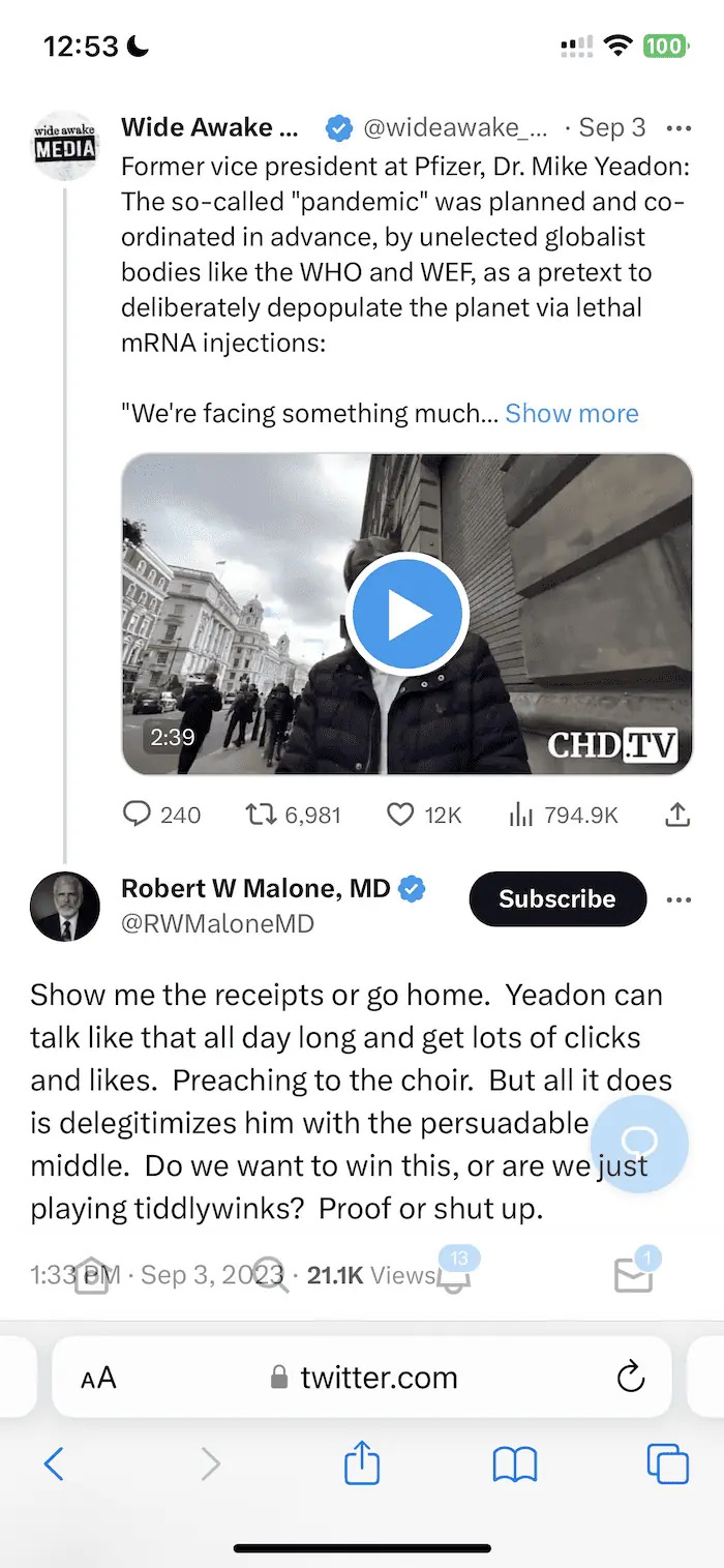 “Show me the receipts or go home. Yeadon can talk like that all day long and get lots of clicks and likes. Preaching to the choir. But all it does is delegitimizes him with the persuadable middle. Do we want to win this, or are we just playing tiddlywinks? Proof or shut up.”