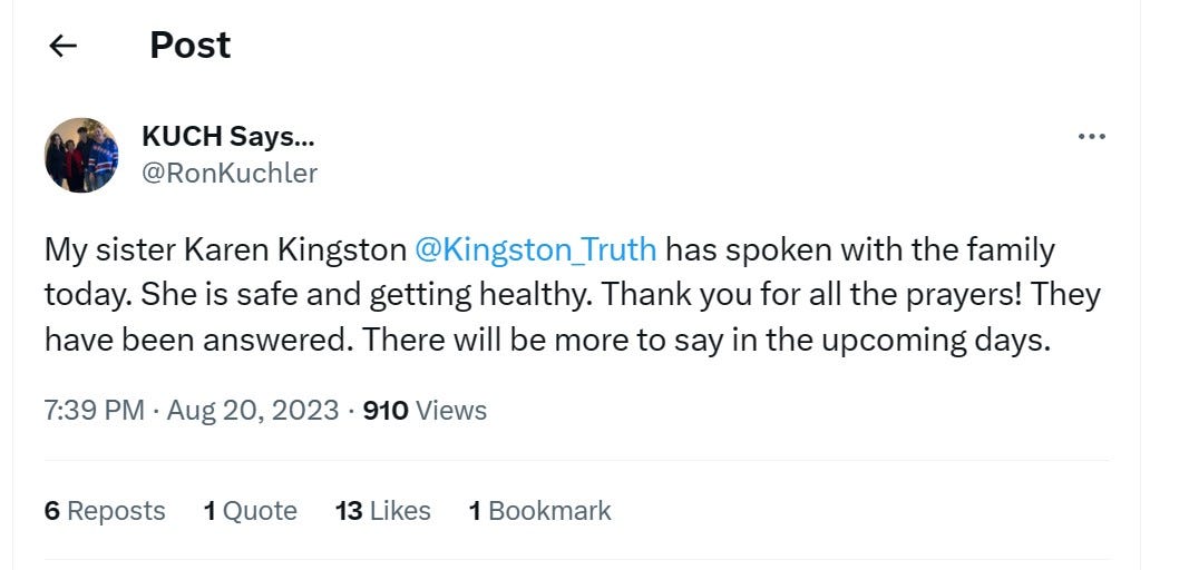 Karen Kingston’s brother, Ron Kuchler, has announced that Karen has made contact, using her own phone, with her son, Gavyn. Ron Kuchler said on his X (Twitter) feed: “My sister Karen Kingston (@Kingston_Truth) has spoken with the family today. She is safe and getting healthy. Thank you for all the prayers! They have been answered. There will be more to say in the upcoming days.”